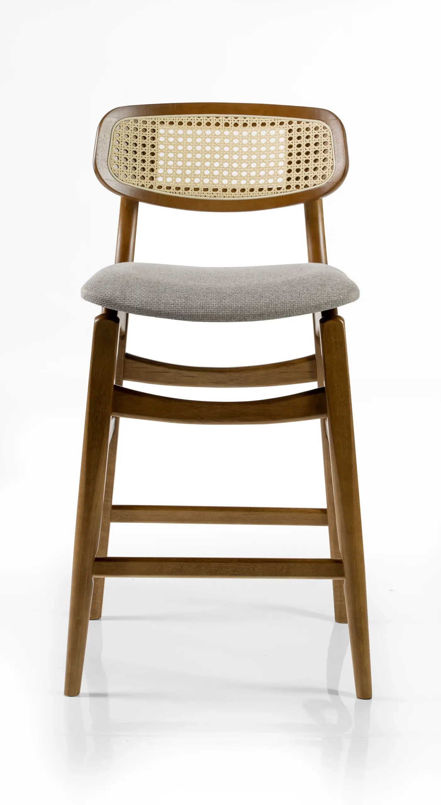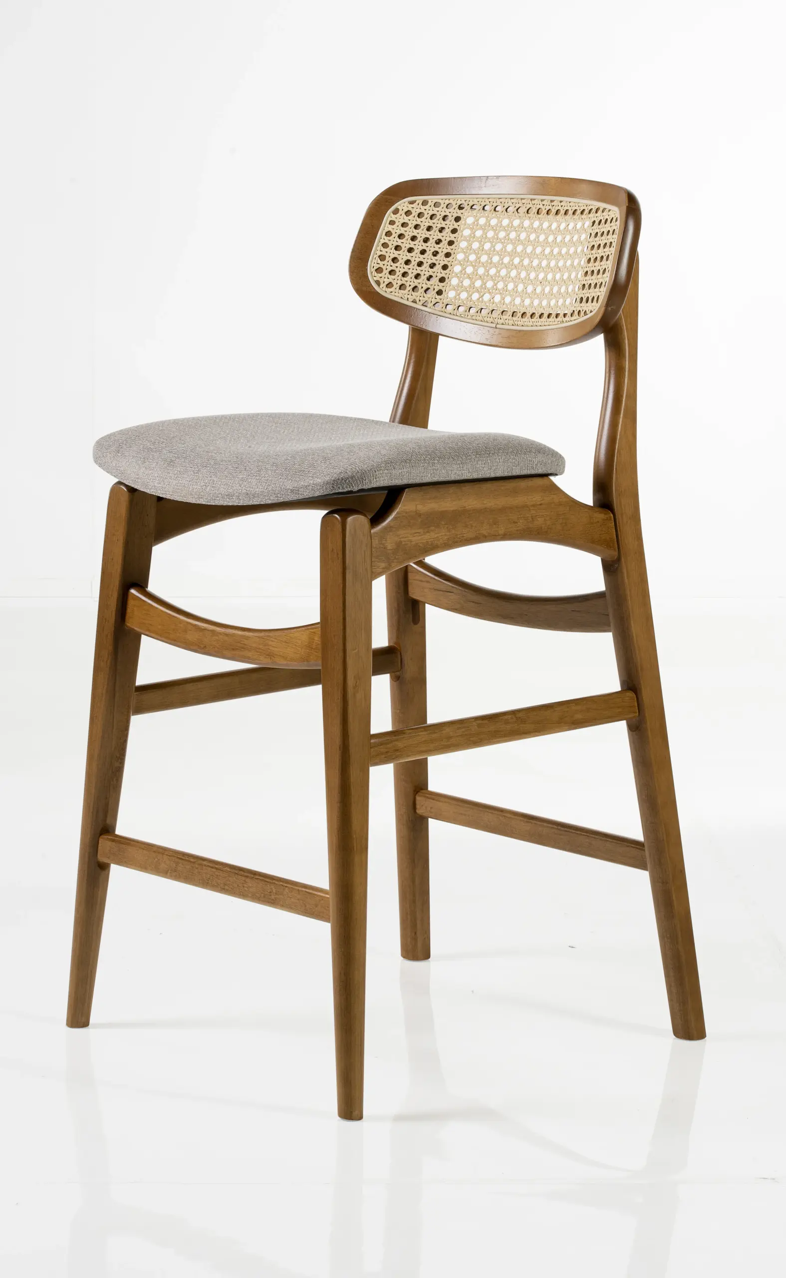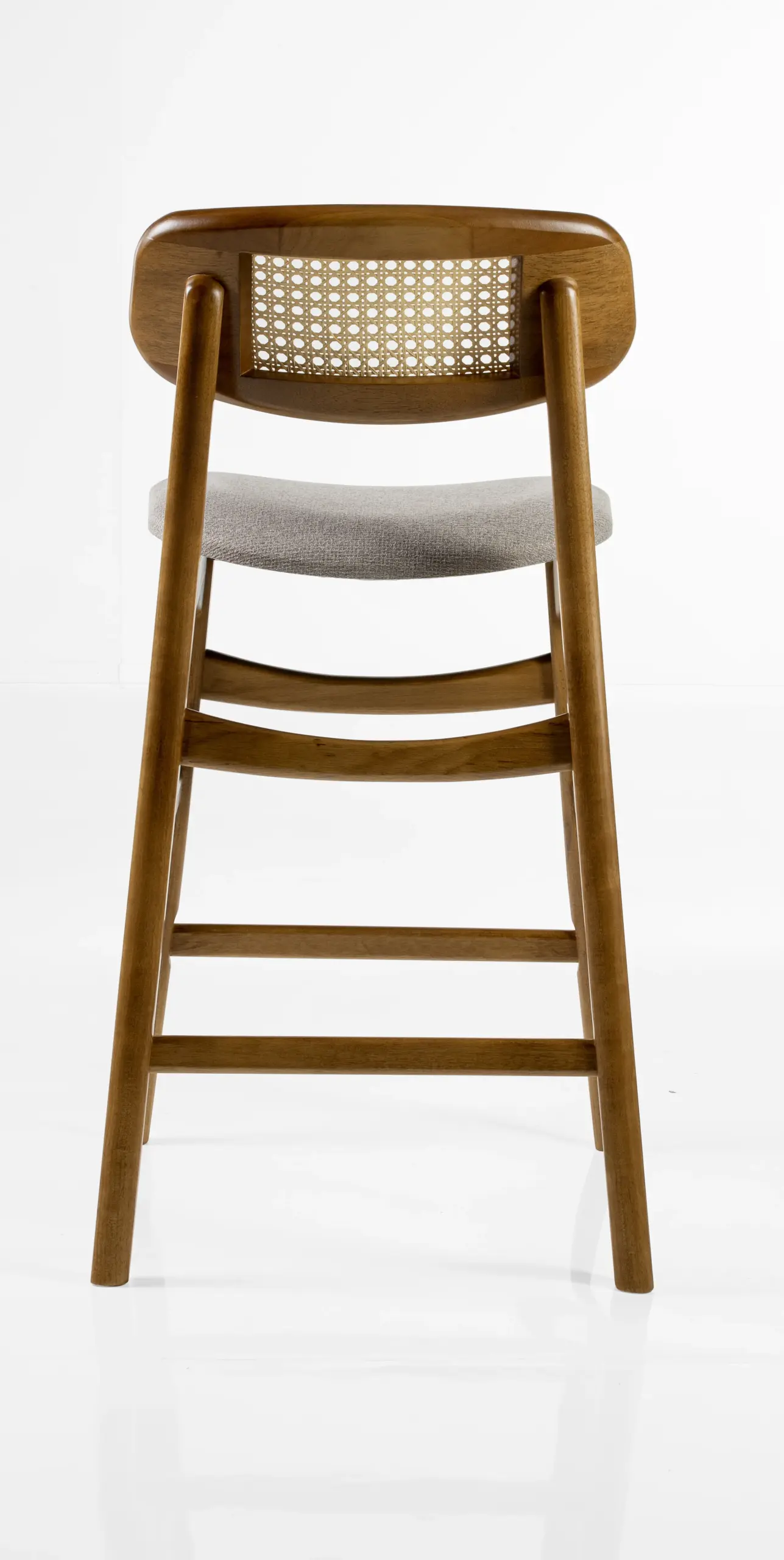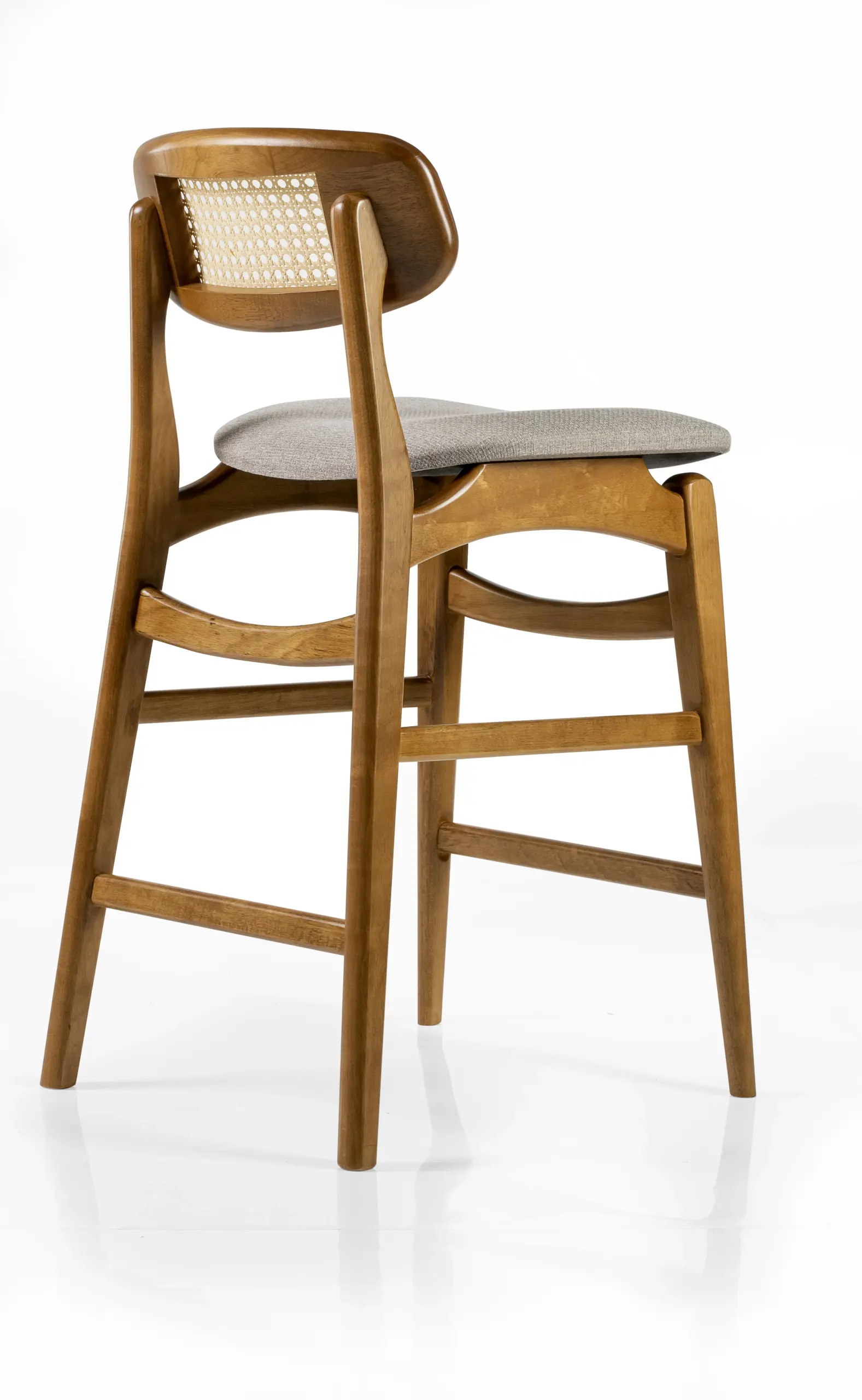 Banqueta Lira madeira maciça, palha e estofado em perfeita harmonia. Design acolhedor e delicado que convida a sentar e apreciar cada detalhe.