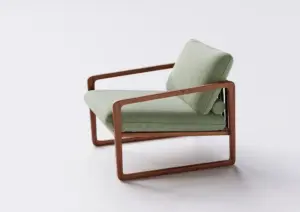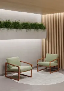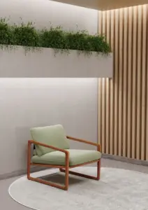 Diferenciais: Braços e pés em madeira maciça, detalhes opcionais em corino para acabamento sofisticado, e pés altos espigados, que facilitam a limpeza e valorizam o design.